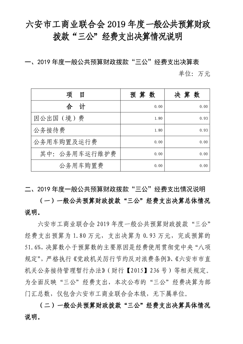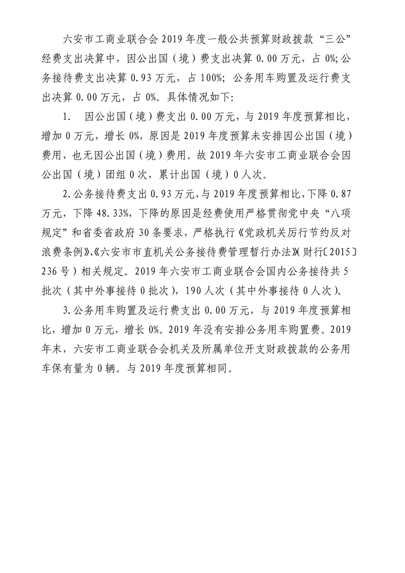 六安市工商業(yè)聯(lián)合會(huì)2019年度一般公共預(yù)算財(cái)政撥款“三公”經(jīng)費(fèi)支出決算情況說(shuō)明